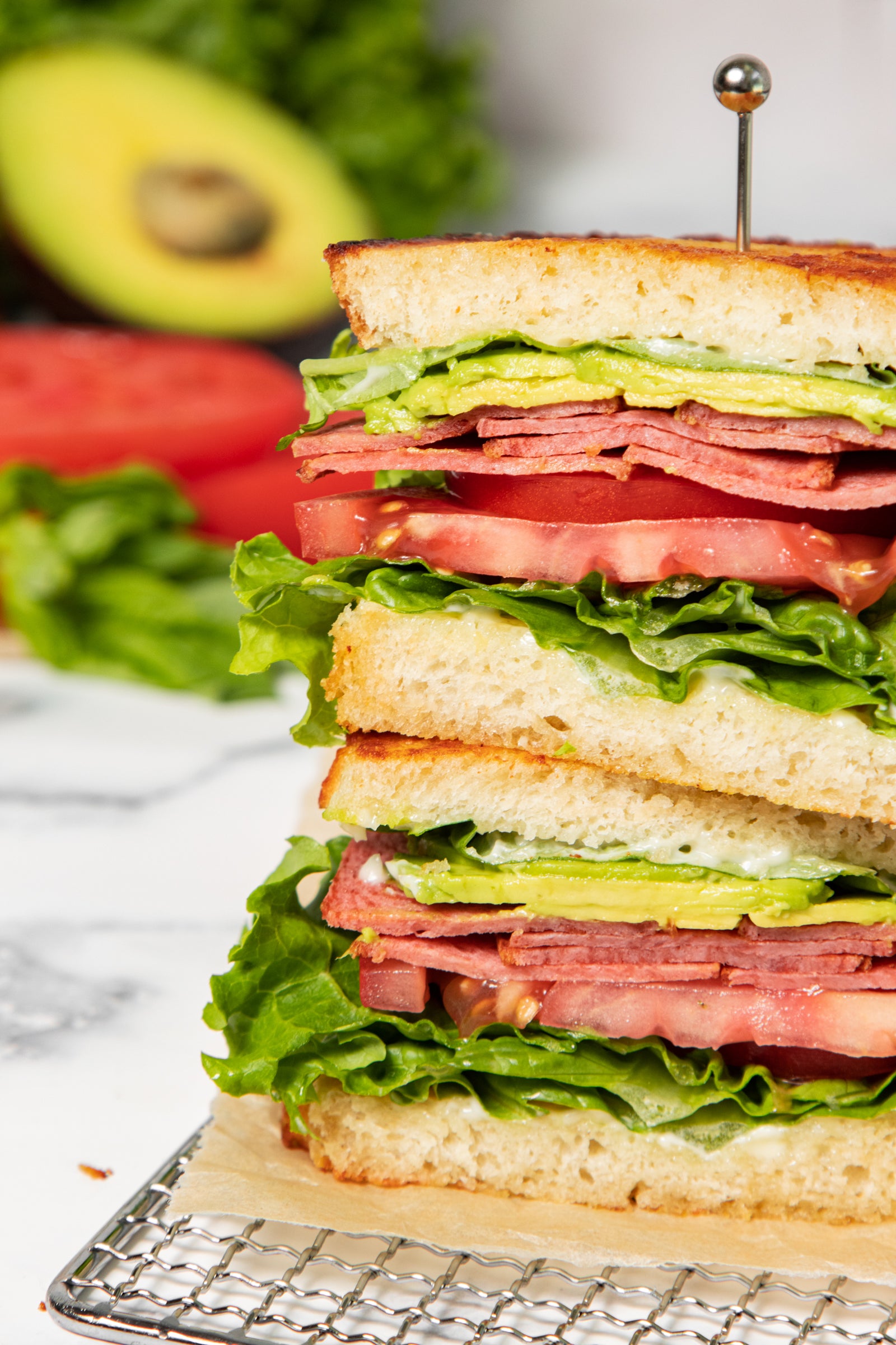 - Assemble your sandwiches with the tomato, avocado, bacon, basil, and lettuce leaves.